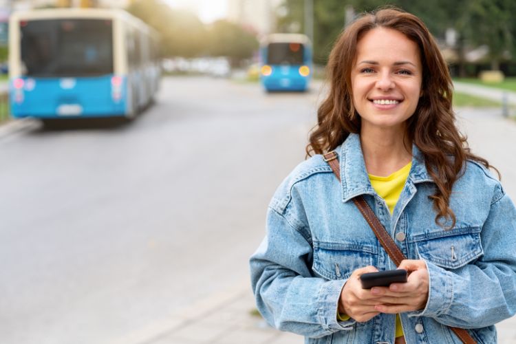 A user checks her next connection at the bus stop via her smartphone – this is what Mobility as a Service feels like in everyday life: simple, connected, on the go. (Copyright: Adobe Stock)