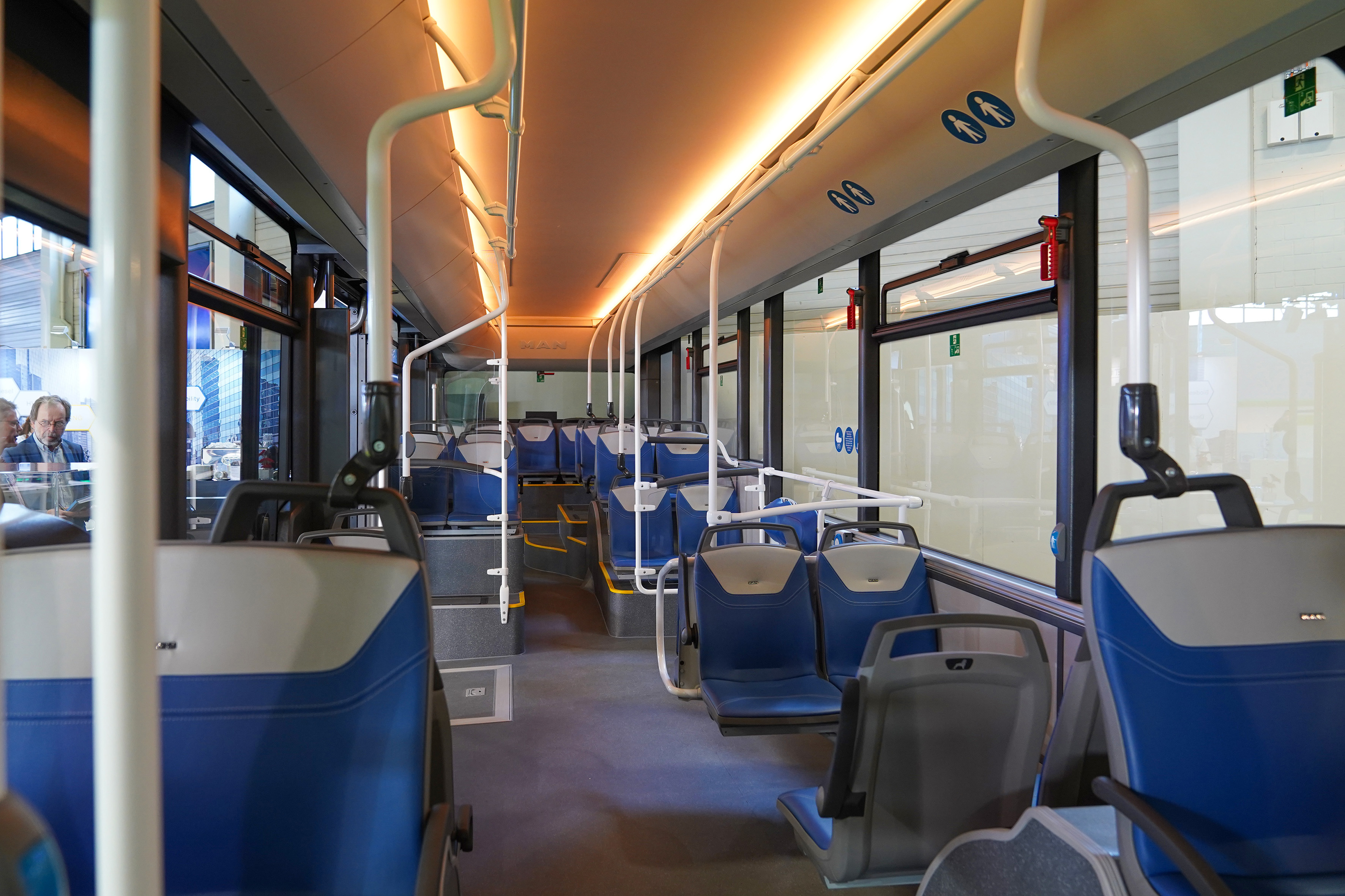 The electric urban bus has gotten its wide rear window back. "We no longer need the engine tower in the back," says Siegfried Seidel of MAN Truck & Bus Germany GmbH, introducing the Lion's City 12 E at BUS2BUS. As a result, the interior is brighter, there is still a low floor design for passenger convenience, and the entire interior feels very uncluttered.